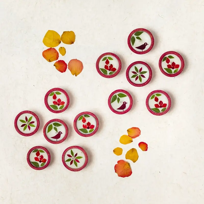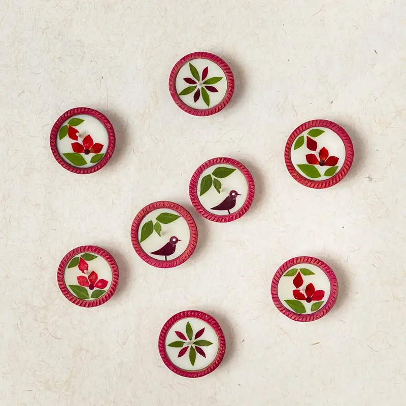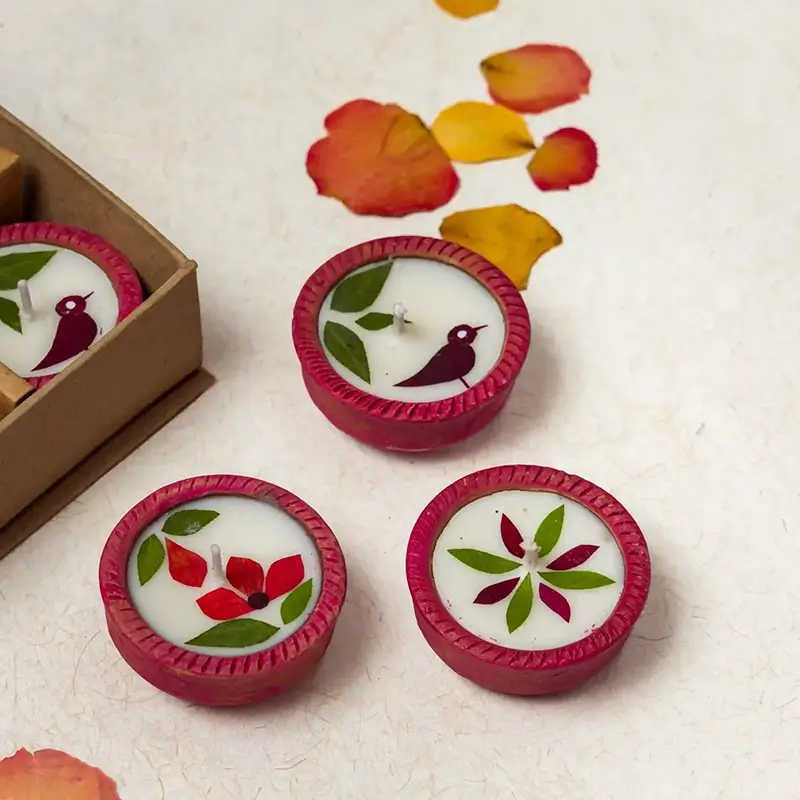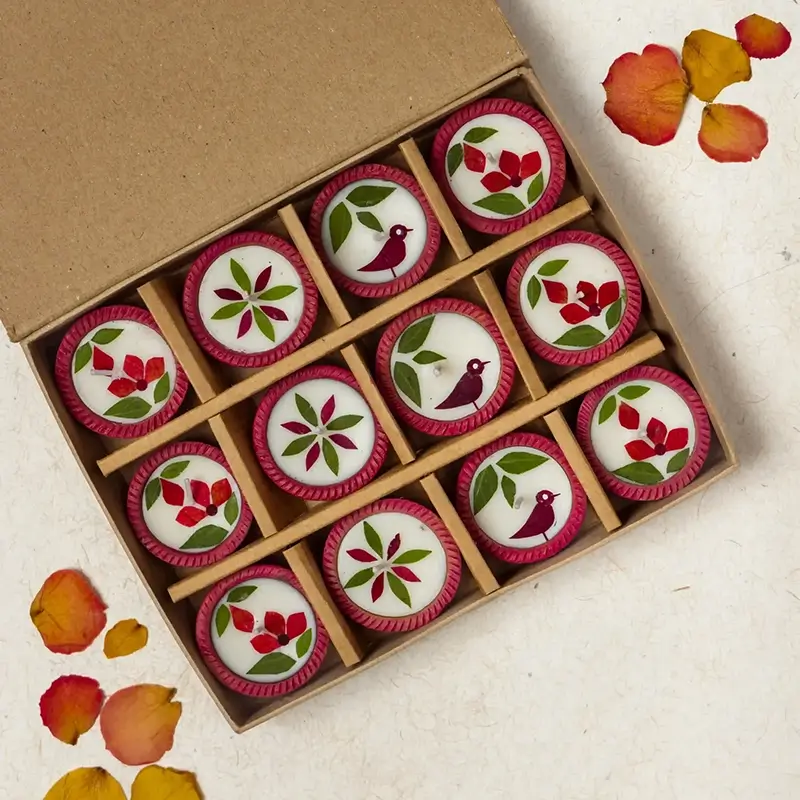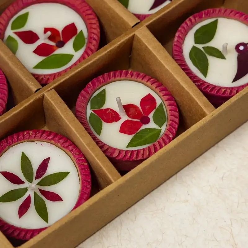 For an eco-friendly Diwali, we bring to you 24 earthen diyas containing natural soy wax and individually cut and pasted real dried flowers. Soy wax is a processed form of soybean oil, which makes it a better alternative to paraffin wax, which is made from petroleum oil. Soy wax also burns slower than paraffin wax, giving you a candle/diya that lasts longer.