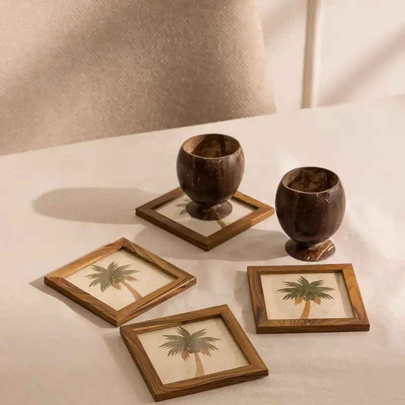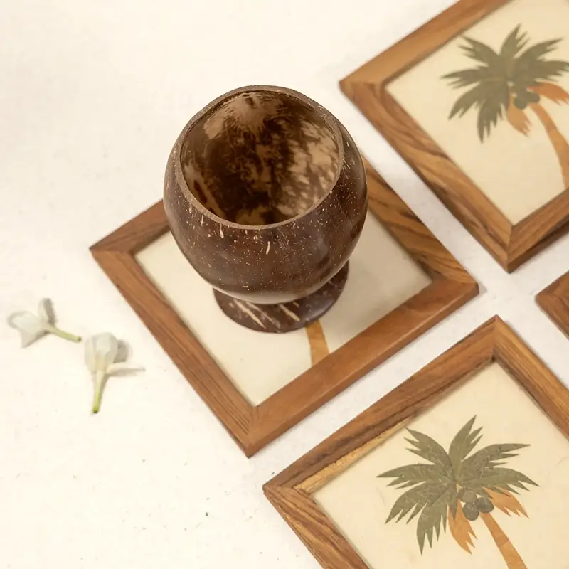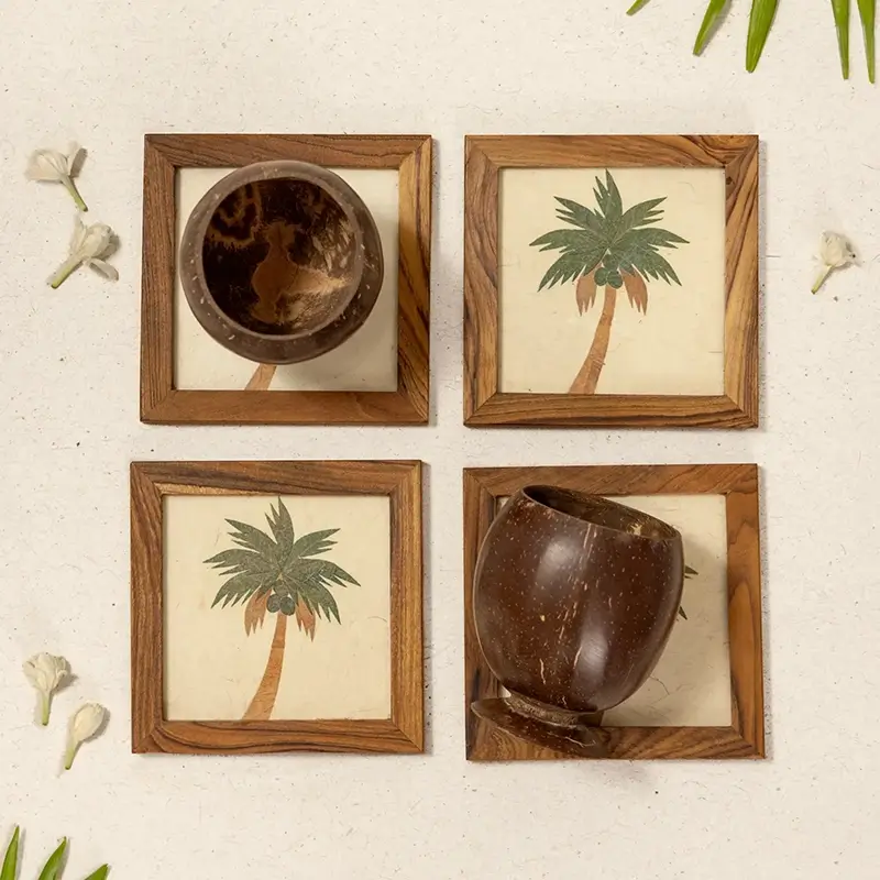 These teak wood coasters are small windows into the coast—each one encasing a handcrafted coconut tree artwork made from real pressed flower petals. Protected under glass and made by Gulmeher’s women artists, they offer an elegant, earthy touch to your table. Thoughtful, durable, and rich in detail—perfect for everyday cups or slow, seaside-inspired sips.