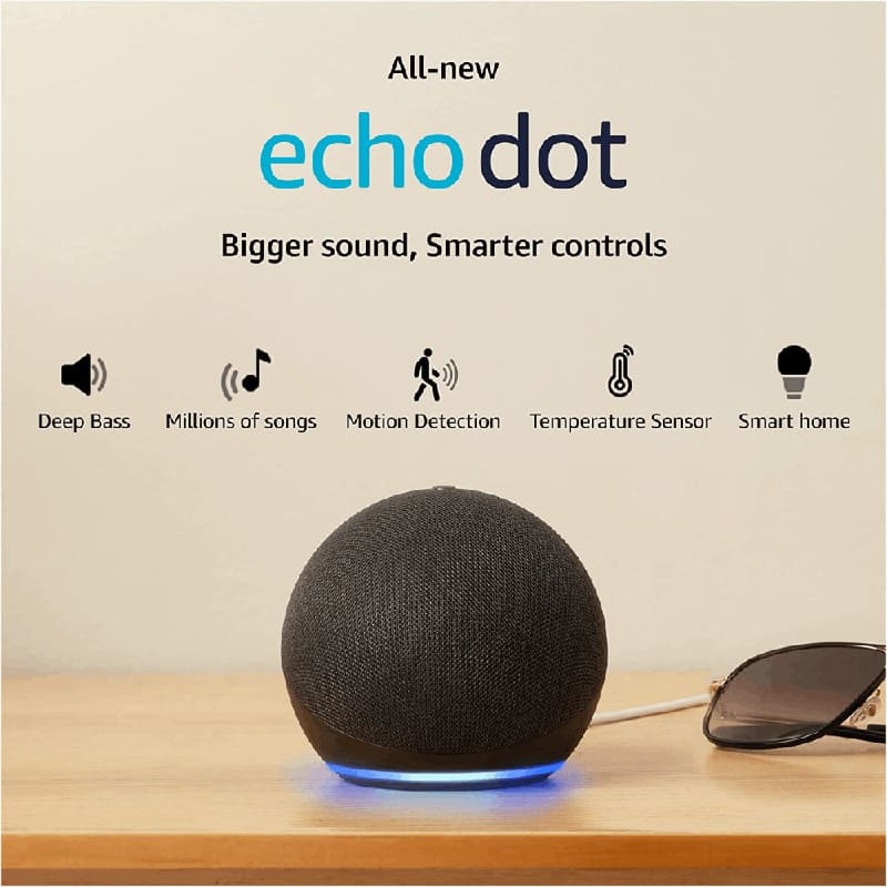 The 5th Generation Echo Dot with Alexa offers improved sound with deeper bass and clearer vocals. Control music, smart devices, and set up routines hands-free by asking Alexa. With motion detection and a temperature sensor, it triggers smart appliance actions. Alexa can manage your day, set reminders, and perform tasks in English or Hindi. Use the Echo Dot as a standalone speaker or connect it to your phone via Bluetooth.