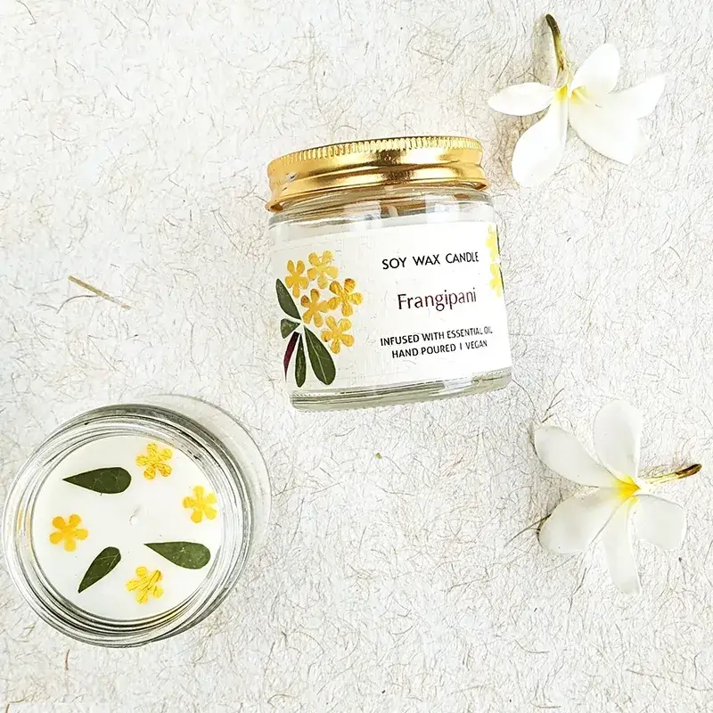 Frangipani Candle box contains: 2 Soy Wax candles (50 gm) infused with Frangipani essential oil in reusable glass jars embellished with flower petals.