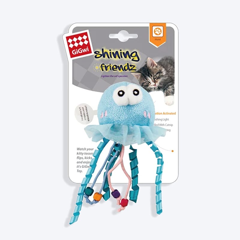 The GiGwi Shining Friends Jellyfish is a soft and fun toy for your cat. It has an LED light that turns on when played with, making it more exciting. Shaped like a cute jellyfish, it’s perfect for your cat to fetch, snuggle, or chew.