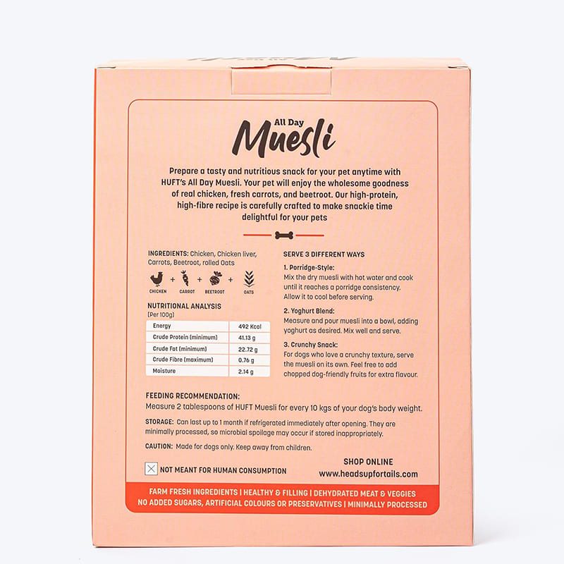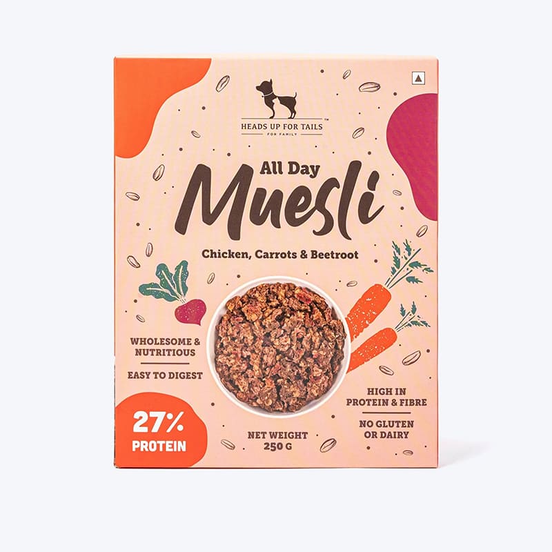 All-Day Muesli is a healthy mix of oats, chicken, carrots, and beetroot made just for your pet. We use oats so it’s safe for pets that can’t have gluten. Oats are full of vitamins, minerals, and biotin, which help keep your dog’s coat shiny. Chicken is easy to digest and full of protein. Carrots and beetroot add fiber and are rich in vitamins A and C. This meal is filling, natural, and great for busy days.