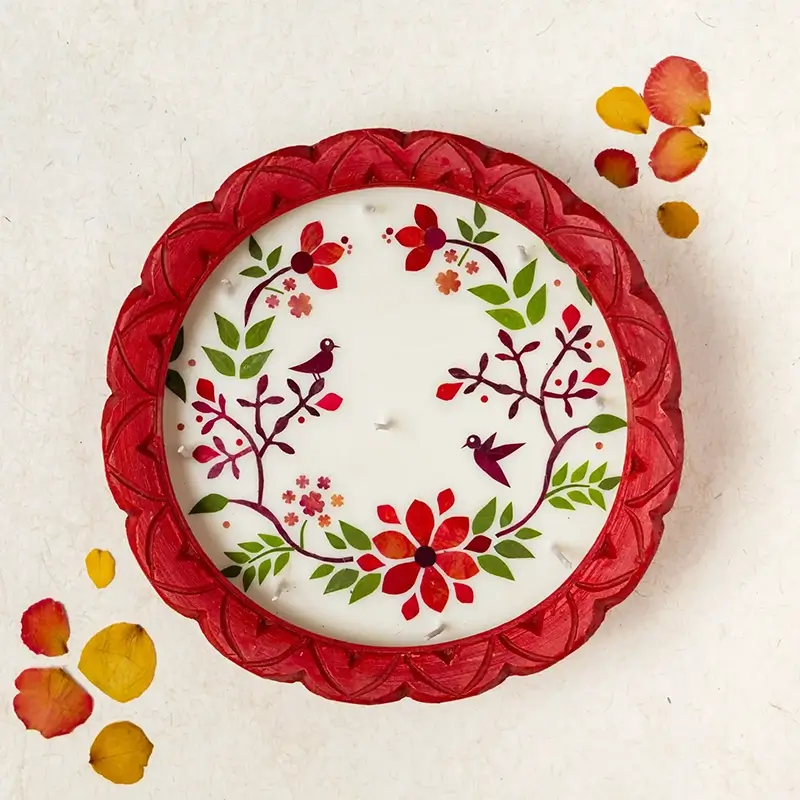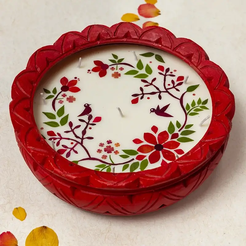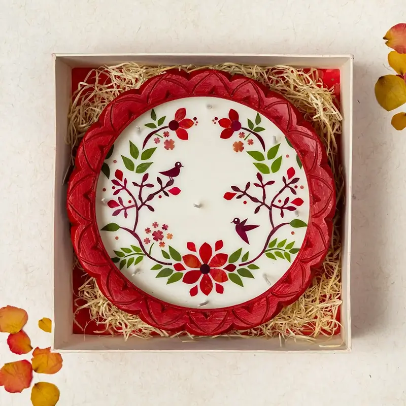 For an eco-friendly Diwali, we bring to you earthen diyas containing natural soy wax and individually cut and pasted real dried flowers. Soy wax is a processed form of soybean oil, which makes it a better alternative to paraffin wax, which is made from petroleum oil. Soy wax also burns slower than paraffin wax, giving you a candle/diya that lasts longer. Dimensions : 25.5×25.5 cm (Diya).