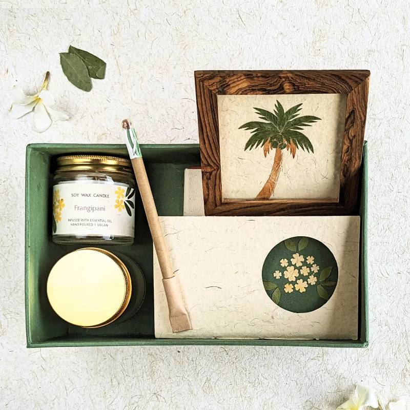 Mindfulness box contains: 1 Calendar, 1 Pocket Notebook, 1 Paper seed pen, 2 Handmade paper postcards embellished with flower petals, 2 Soy Wax candles (50 gm) infused with Frangipani essential oil, 2 Teak wood Coasters (embellished with flower petals), 1 Reusable box ( 24.5 x 15.5 x 9 cm)