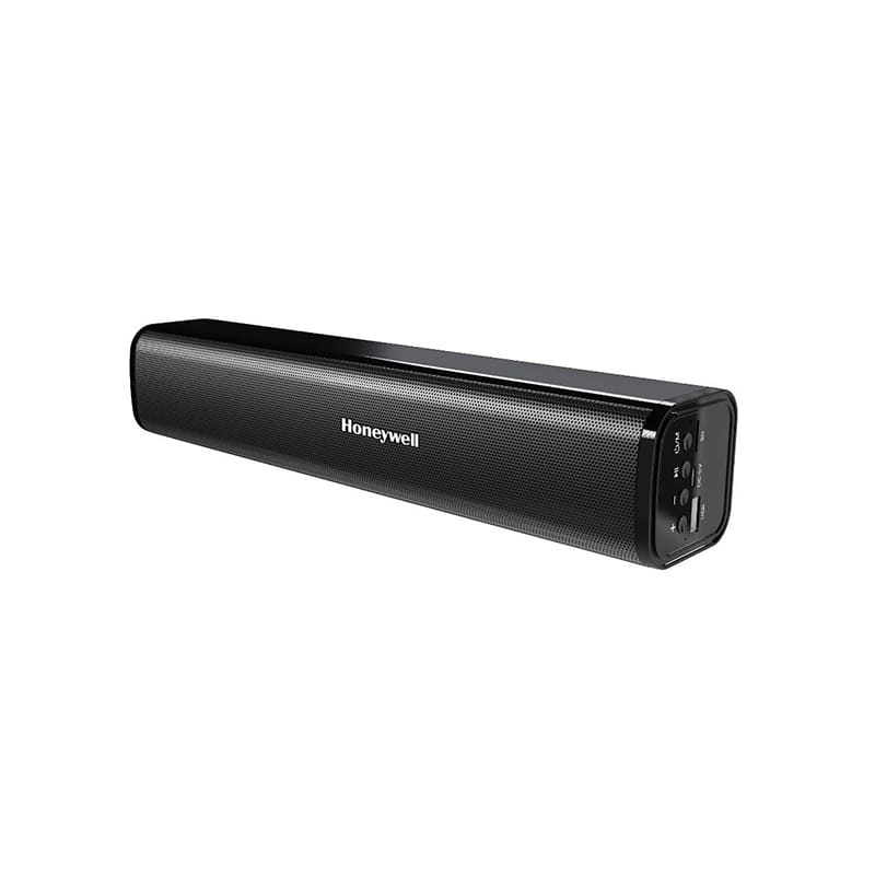 The Honeywell Moxie V1000 Soundbar offers immersive 10W stereo sound with dual 52mm drivers and Bluetooth 5.0 connectivity for seamless wireless streaming. With up to 15 hours of playtime, TWS pairing, and a 1200 mAh rechargeable battery, it’s perfect for long listening sessions. It features a digital LED display and supports TF card, AUX, and USB inputs. Compact and stylish, it comes with a 2-year warranty.