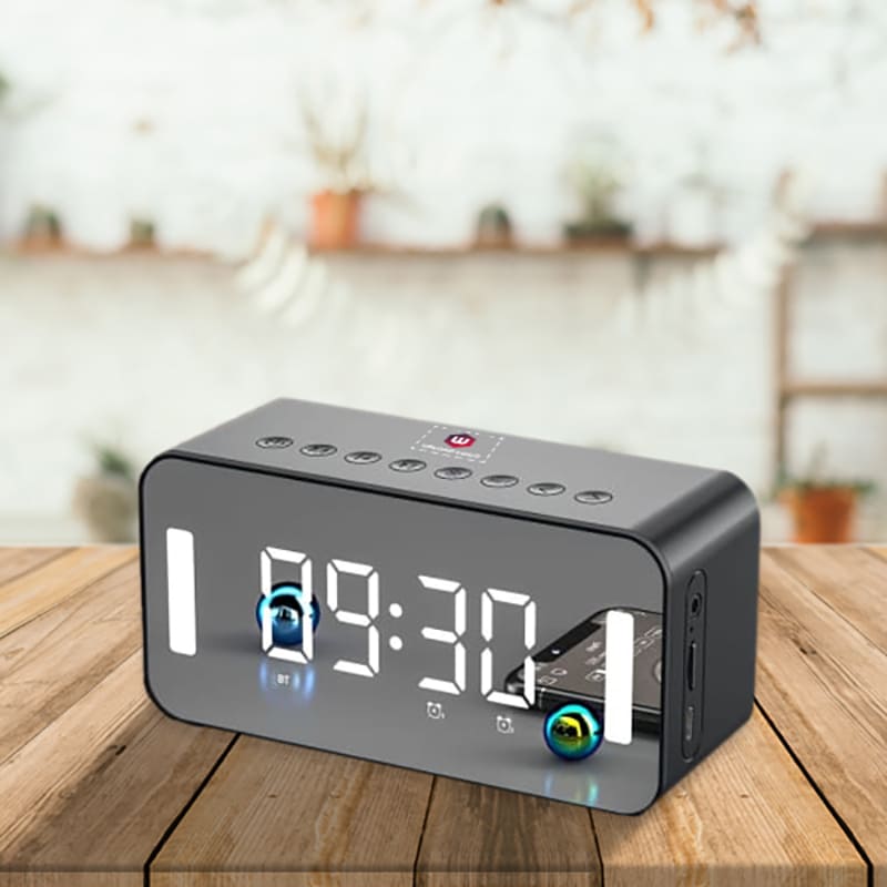 Upgrade your bedside or workspace with this sleek Multi-Functional Clock with Speaker. Designed for modern convenience, it features a large digital LED display for time, temperature, and alarms, along with a built-in Bluetooth speaker for rich, wireless audio. Enjoy your favorite music, set dual alarms, and even take calls—all from a single compact device. With touch controls, USB charging, and a stylish mirrored surface, it’s the perfect fusion of tech and style for any setting.
